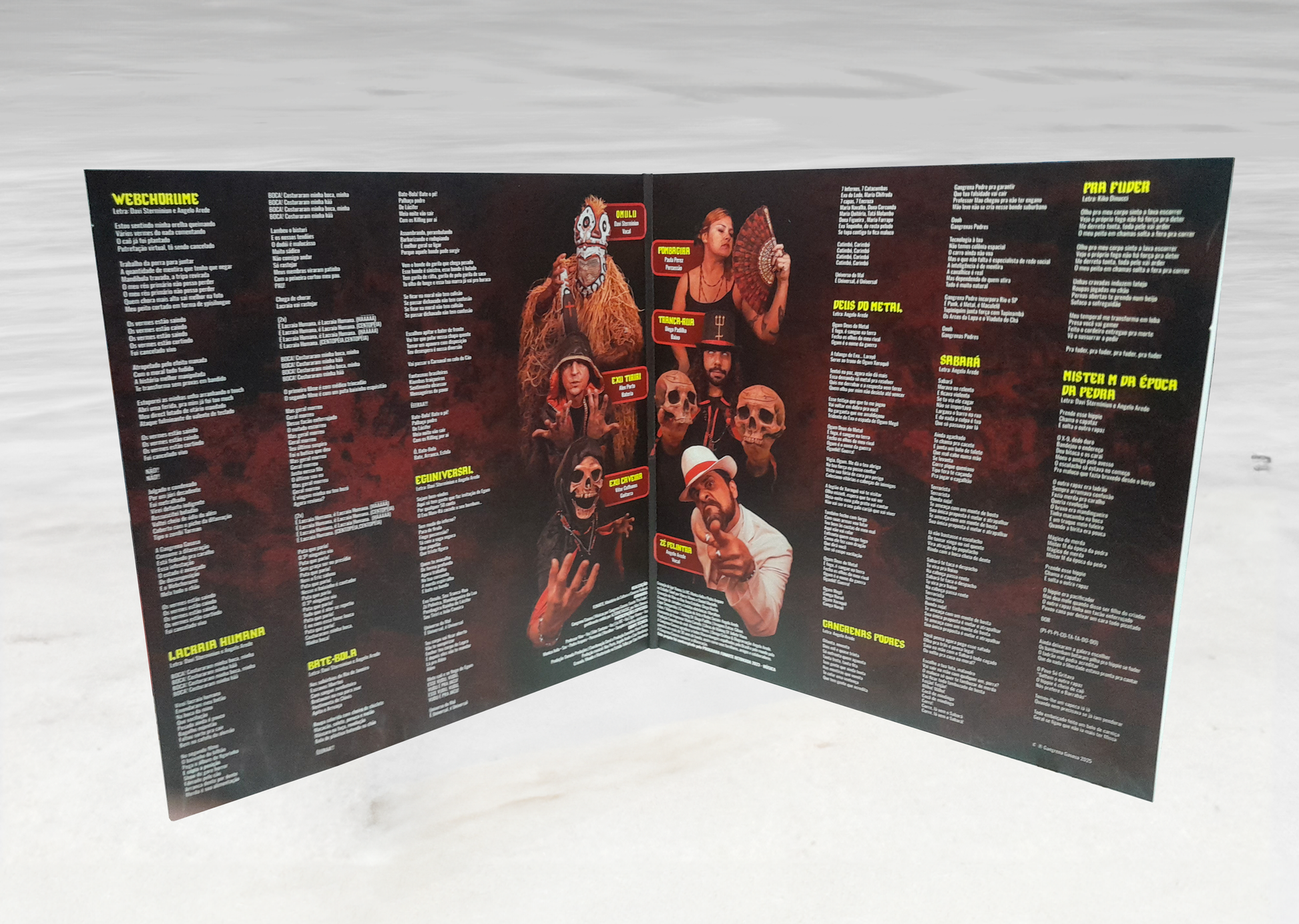 Em faixas como “Webchorume” e “Gangrenas Podres”, o tema das redes sociais, do cancelamento e de toda a loucura tecnológica entram no repertório da banda, com letras potentes que subvertem o modus operandi da nossa sociedade. Já em “Eguniversal”, a letra de Davi Sterminiun e Angelo Arede faz uma crítica ao fanatismo religioso e aos falsos profetas.
